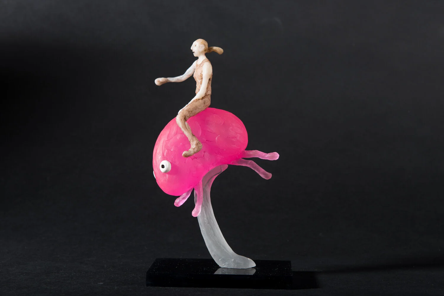 A strikingly coloured bizarre creature and its rider, offering a humorous take on life’s many twists and turns.